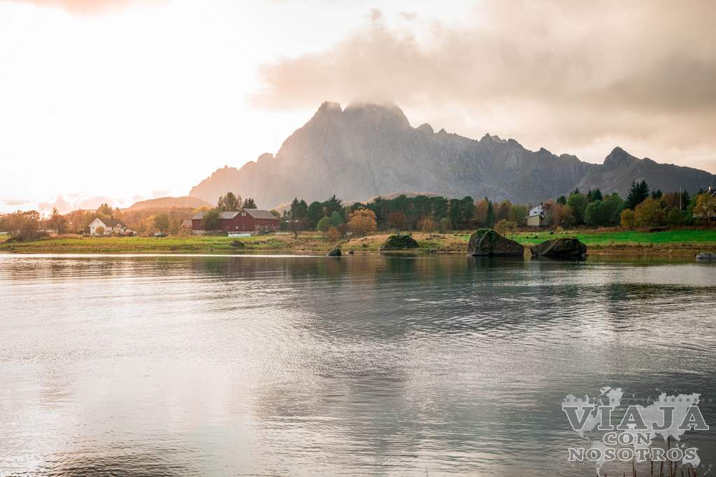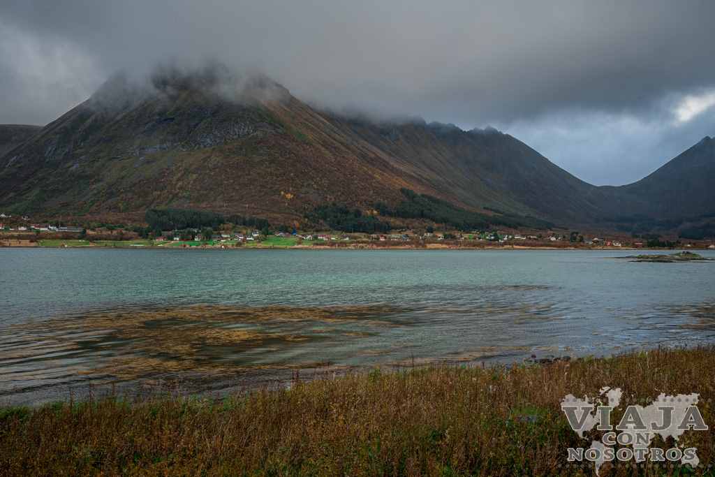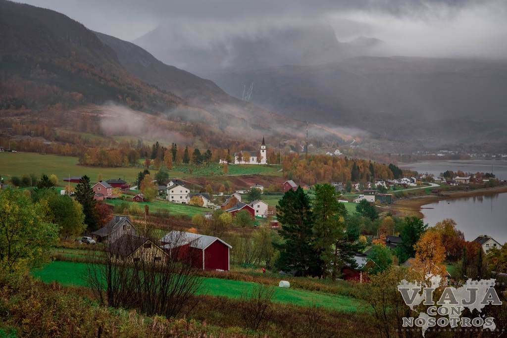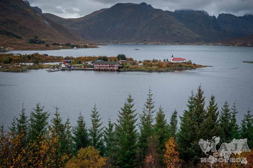 Paramos en el área de descanso de Austnesfjorden. Desde aquí, se puede ver el pueblecito de Vagan. Un pueblo que está en medio del mar, rodeado de montañas, donde destaca su Iglesia Sildpollnes. Preciosa foto. A la vuelta, unos días más tarde, veríamos esta misma escena, pero con el paisaje nevado.