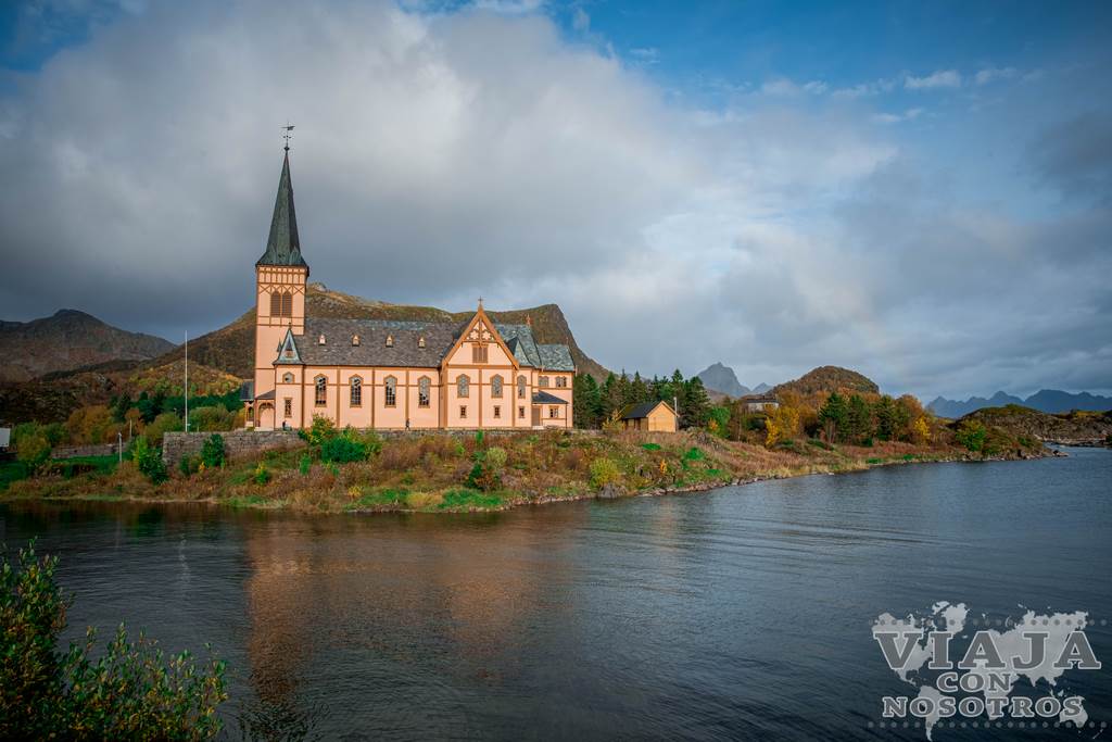 En la misma carretera se encuentra la Iglesia de Vagan. Es considerada como la Catedral de Lofoten. Es el edificio de madera más grande de Lofoten y fue inaugurado en 1898. Es una de las iglesias más grande de Noruega y puede albergar a unas 1200 personas. Tiene un marcado estilo neogótico, por lo que no se nos parece a ninguna de las que hemos visto en el viaje.