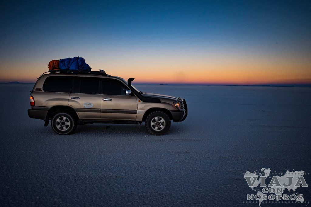 El día terminó con una puesta de sol mágica en medio del salar. Nuestro guía nos hizo videos divertidos, haciendo círculos con el coche alrededor de nuestro grupo.