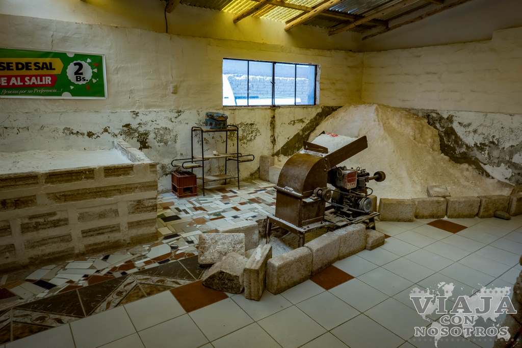 A unos 15 minutos, llegamos a Colchani, un pueblo conocido por sus tiendas de artesanías. Nuestro guía nos llevó a un patio donde nos explicaron el proceso de extracción y preparación de la sal. Extraen bloques de sal, los secan, los trituran y los procesan para hacerlos comestibles. Toda la sal producida aquí se consume en Bolivia, ya que no se exporta.